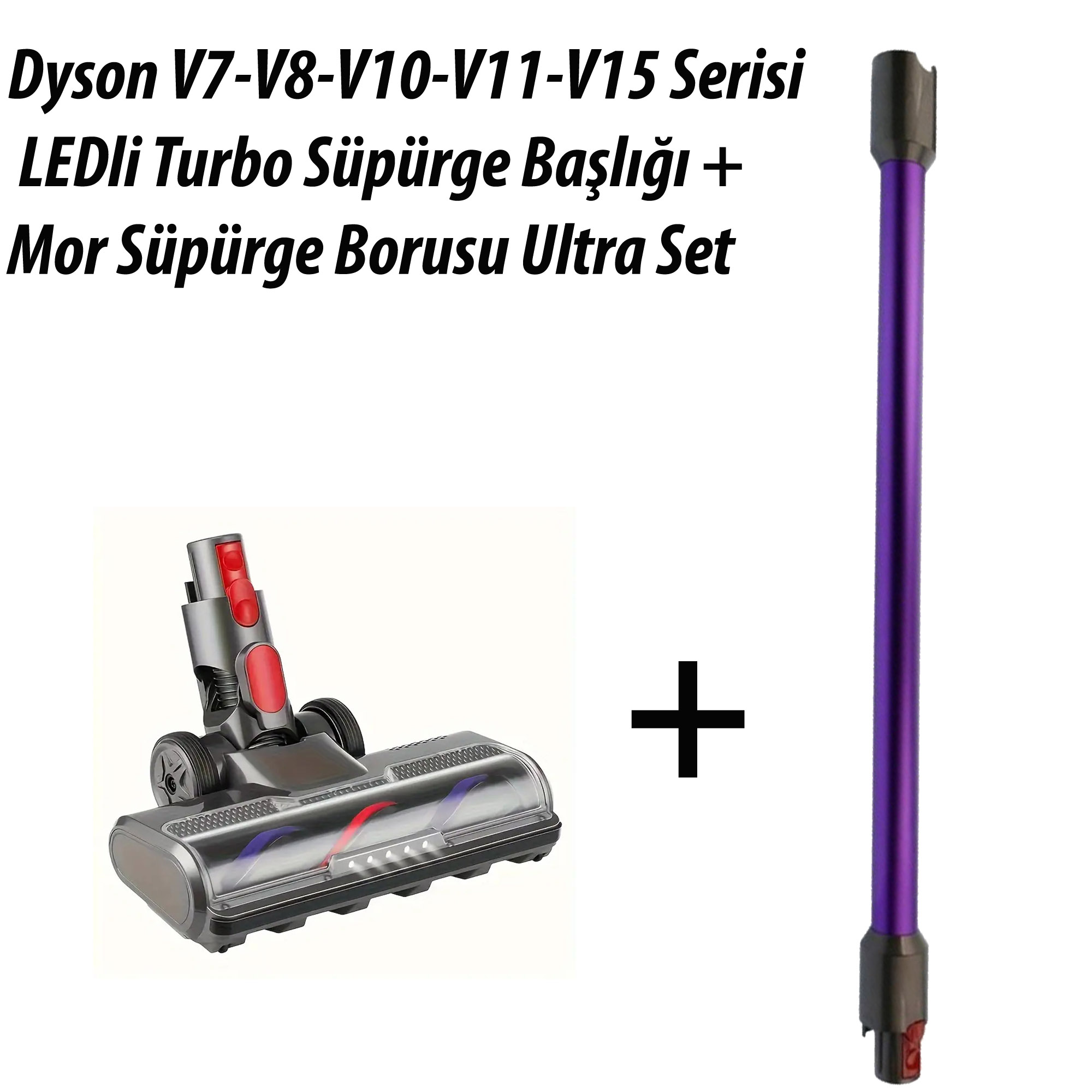 Dyson ile uyumlu V7-V8-V10-V11-V15 Serisi LEDli Turbo Süpürge Başlığı + Mor Süpürge Borusu Ultra Set Ticimark