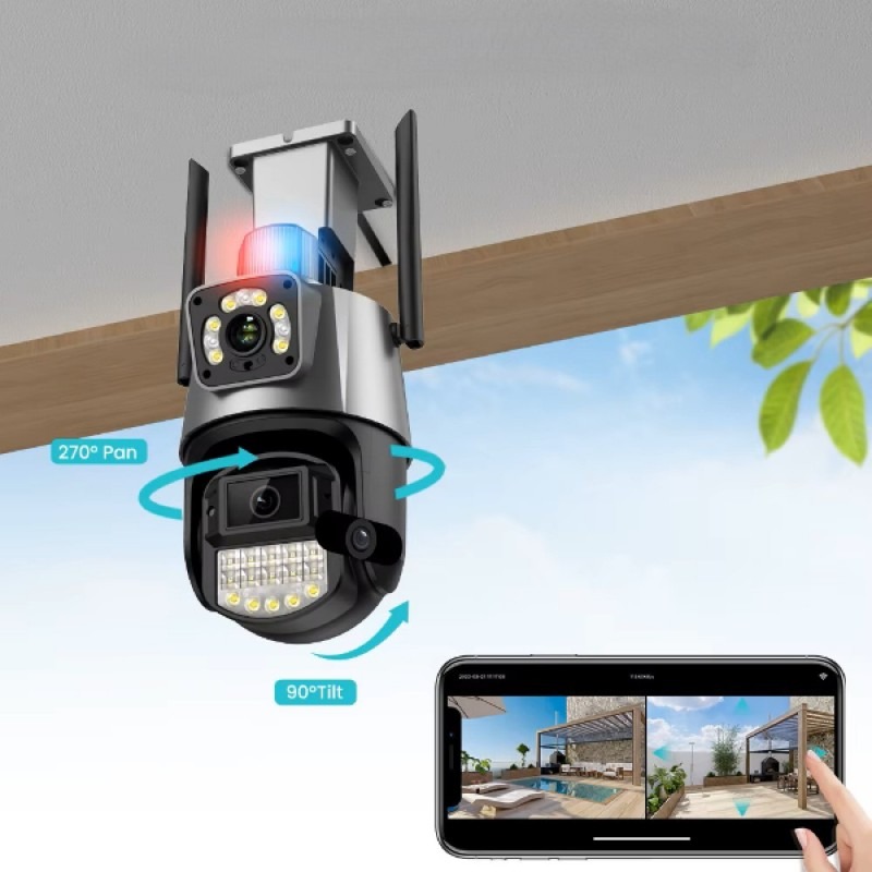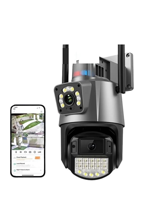 Grandsecurity / Çift Lensli Dış Mekan Güvenlik Kamerası 355° Yatay Ve 90° Dikey Açı Renk : SiyahÇakarlı Çift Lensli Dış Mekan Güvenlik KamerasıÜrün ÖzellikleriÇakarlı Çift Lensli Dış Mekan Güvenlik Kamerası, Yüksek Çözünürlüklü 8mp Görüntü Kalitesiyle Profesyonel Güvenlik Çözümleri Sunar. Çift Lens Tasarımı Sayesinde Geniş Açılı Ve Detaylı Görüntü Sağlar.Gece Görüş Özelliği İle Düşük Işıkta Bile Net Kayıt Yapabilir Ve Tam Renkli Gece Görüntüleme Desteğiyle Güvenliği En Üst Seviyeye Taşır. Çakarlı Alarm Özelliği Sayesinde Şüpheli Durumlarda Görsel Ve İşitsel Uyarı Verir. Çift Yönlü Ses Desteği Sayesinde Kamera Üzerinden Karşılıklı İletişim Kurulabilir.Ip66 Su Geçirmezlik Standardına Sahip Olan Kamera, Yağmur, Kar Ve Toz Gibi Zorlu Hava Koşullarında Sorunsuz Çalışır. Hareket Algılama Özelliği İle Anında Mobil Cihazlara Bildirim Gönderir Ve Bluetooth Desteğiyle Hızlı Bağlantı İmkânı Sunar. Ptz Kontrol Desteği Sayesinde 355° Yatay Ve 90° Dikey Açıyla Çevreyi Eksiksiz İzleyebilirsiniz.Paket İçeriği1 Adet Çakarlı Çift Lensli Dış Mekan Güvenlik Kamerası Ticimark