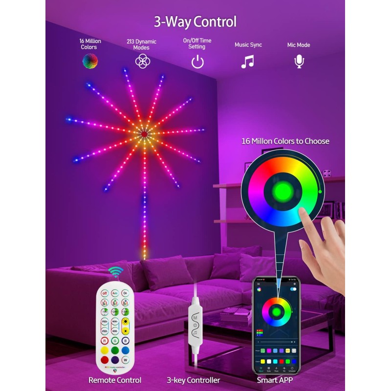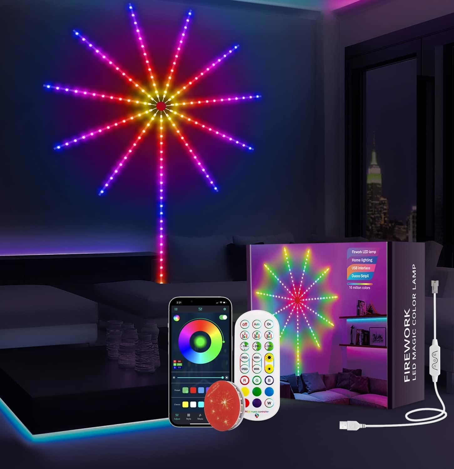 RGB Firework LED Duvar LambasıÜrün Açıklaması:RGB Firework LED Duvar Lambası, mekanınıza renk ve hareket katmak için tasarlanmış modern bir dekoratif ışık kaynağıdır. Telefon uygulaması ve uzaktan kumanda ile kolayca kontrol edilebilir. 16 milyon renk seçeneği ve farklı modları sayesinde her türlü ortam için ideal bir atmosfer oluşturur. USB ile güçlendirilir, bu sayede taşınabilir ve kullanımı kolaydır. Evinize, ofisinize veya parti ortamınıza eşsiz bir hava katın!Bağlantı: USBRenk Seçenekleri: 16 milyon RGB renkKontrol Yöntemleri: Telefon uygulaması, uzaktan kumandaÖzellikler: Farklı mod seçenekleri, parlaklık ve hız ayarlama, müzikle senkronizasyonKullanım Alanları: Salon, yatak odası, ofis, parti dekorasyonuPaket İçeriği10 × Kısa havai şeritler (her biri 50 cm uzunluğunda)1 × Uzun ışın havai şerit (150 cm uzunluk)1 × Yuvarlak Şerit Hub1 × Uzaktan kumanda(pil CR2025 dahildir)1 × Usb güç kablosu (163 cm uzunluğunda)1 × İngilizce kullanım klavuzu Ticimark