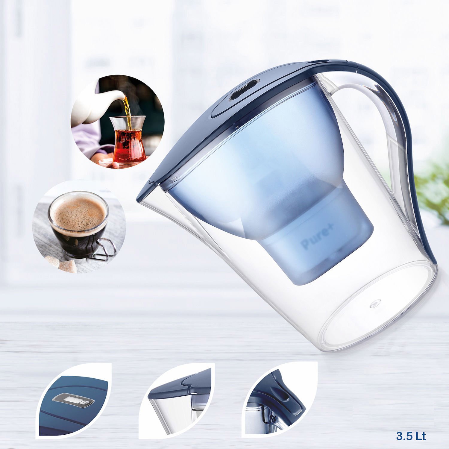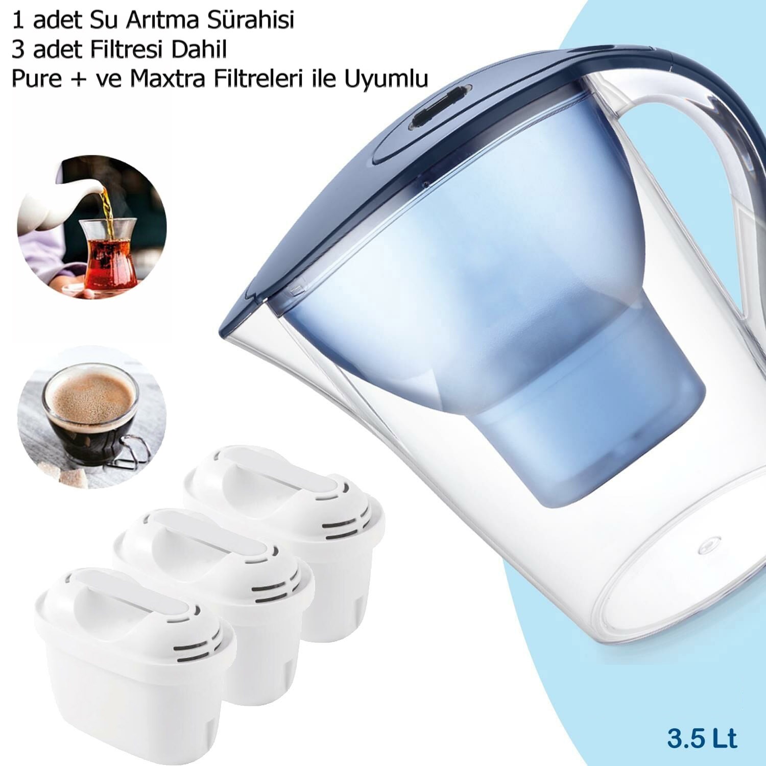Su Arıtma Sürahisi I Pure ve Maxtra Filtreleri ile Uyumlu 3 adet Extra Filtre Dahil 3,5 LT3,5 LT kapasite ile tüm gün kullanımınızı karşılar.Pure+ su arıtma filtreleri 150 litre ile 1 aylık kullanımınız için yeterli ve uygun fiyatlıdır.Kullanımı:-Pure+ filtreyi sürahinize uygulayın.-İlk sefer arıtılan suyu çiçek sulamak için kullanın.-Sonrasında arıtılan su kullanıma hazırdır.-Yemeklerinize, çay ve kahvelerinize lezzet katacak arıtılmış suyunuzu güvenle kullanabilirsiniz.Jugg Su Arıtma sürahileri ile suyunuz 4 aşamalı arıtma sayesinde daha lezzetli ve güvenli.Kullanımı kolay, ekonomik ve uluslararası sertifikaları ile güvenlidir.Kutu içeriği:-1 Adet JUGG 3.5 LT Su Arıtma Sürahisi-1 Adet PURE+ 4 Aşama Üstün Su Arıtma Filtresi (Minimum 150 Lt kullanım)* JUGG model sürahilerde Pure+ filtre dışında, Maxtra ve Maxtra+ filtreleri ile de uyumludur.** Pure+ filtresi ise Brita ve Diğer Su Arıtma sürahileri ile uyumludur. Bazı modeller için uyumluluk adaptörü gerekebilir. Kutu içerisinde sağlanmaktadır.